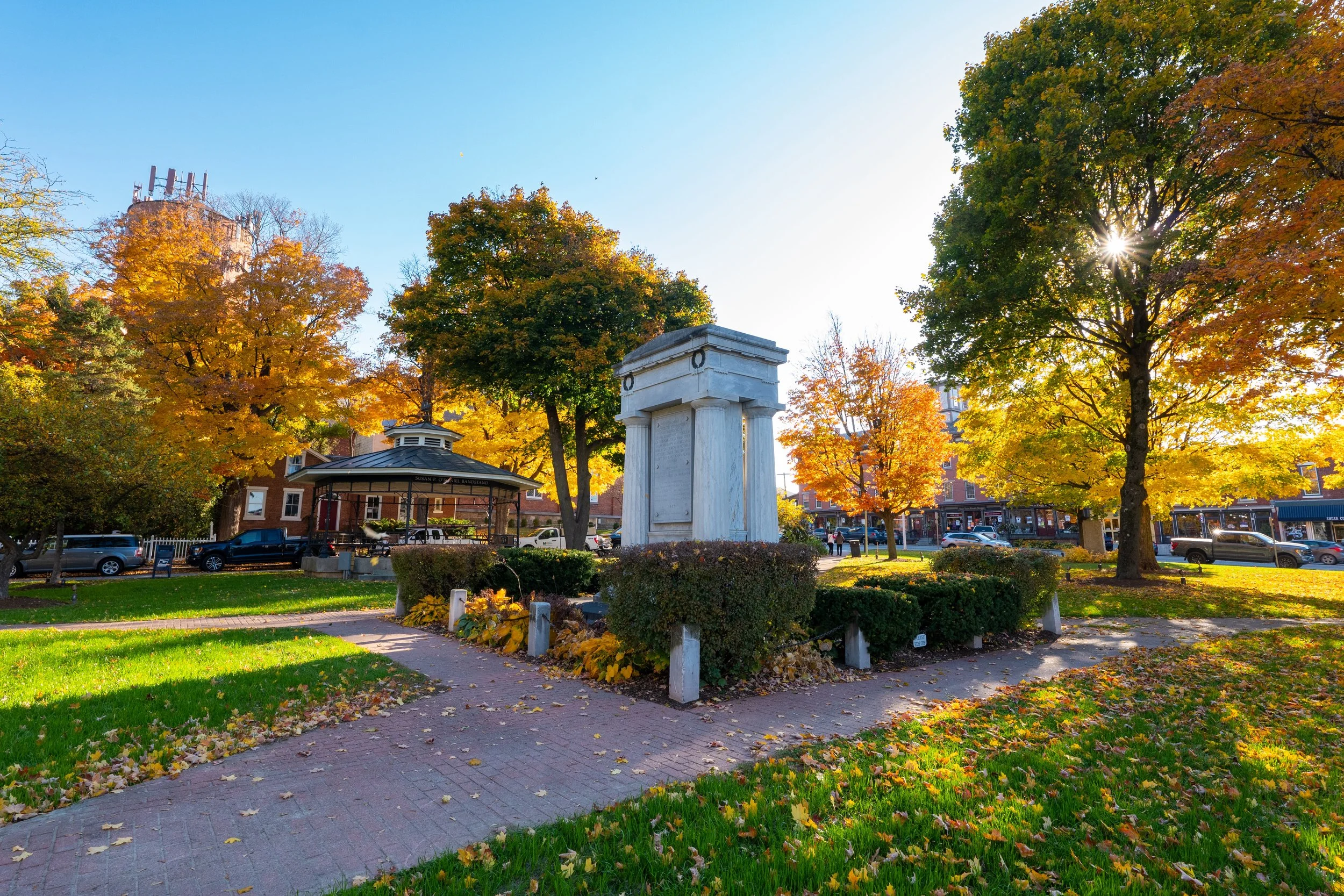 City park, located downtown at 179 Main Street, hosts numerous public gatherings throughout the year including a farmers market and concerts on the bandstand. Benches, picnic tables, and bike racks provide space to enjoy the outdoors. Ample parking surrounds the park including one EV charging station.